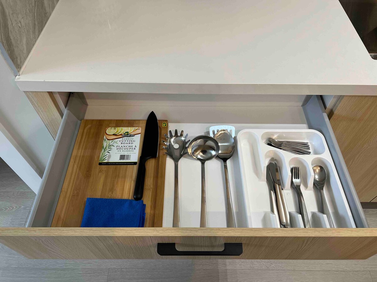 Guest accessEntire condo, 1 underground parking space and more visitor parking and kids play area.