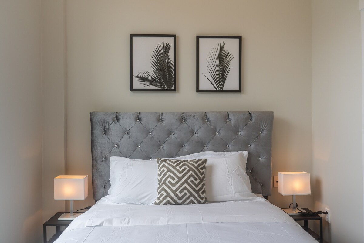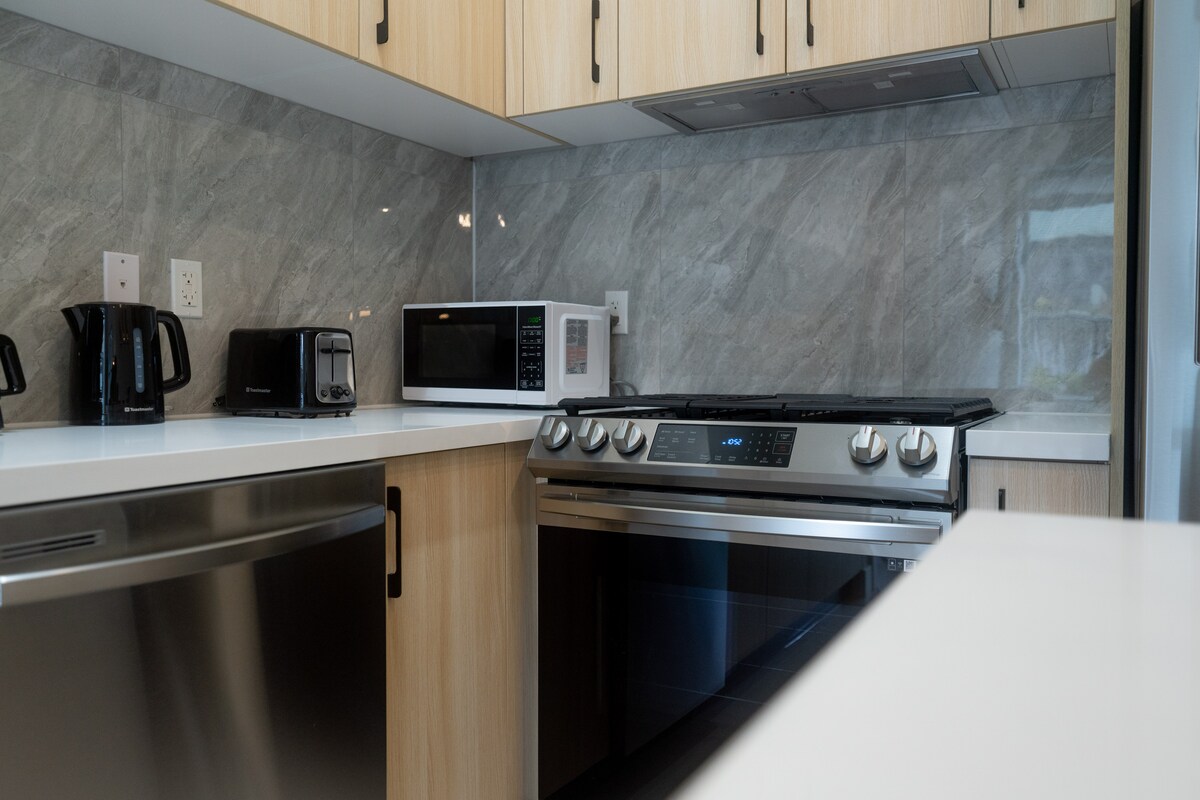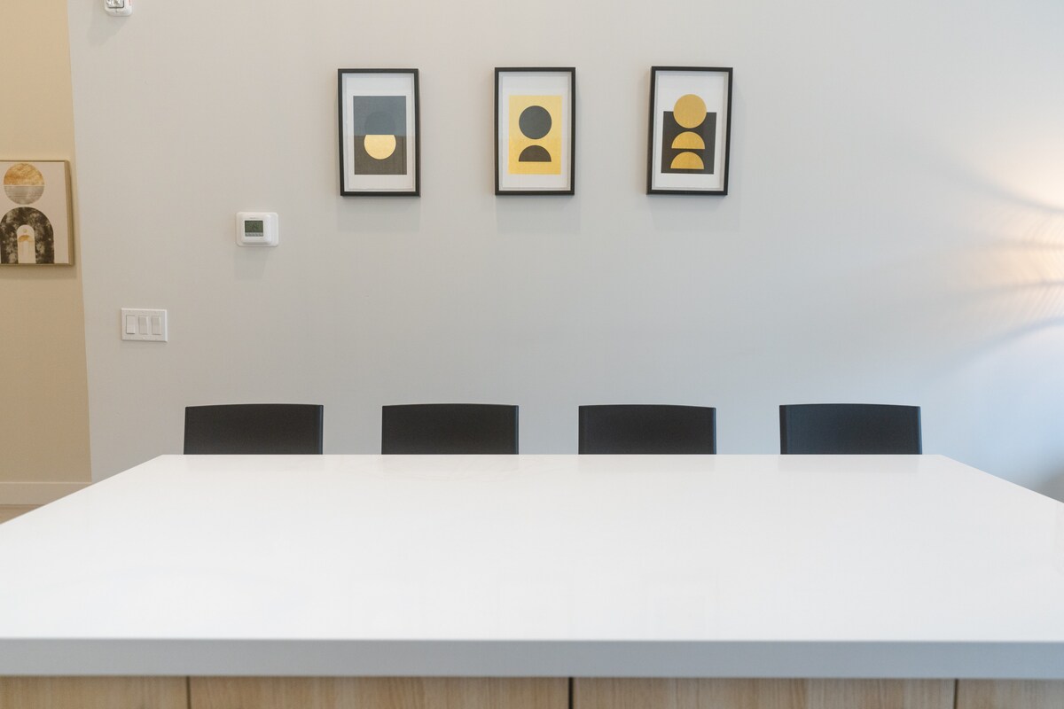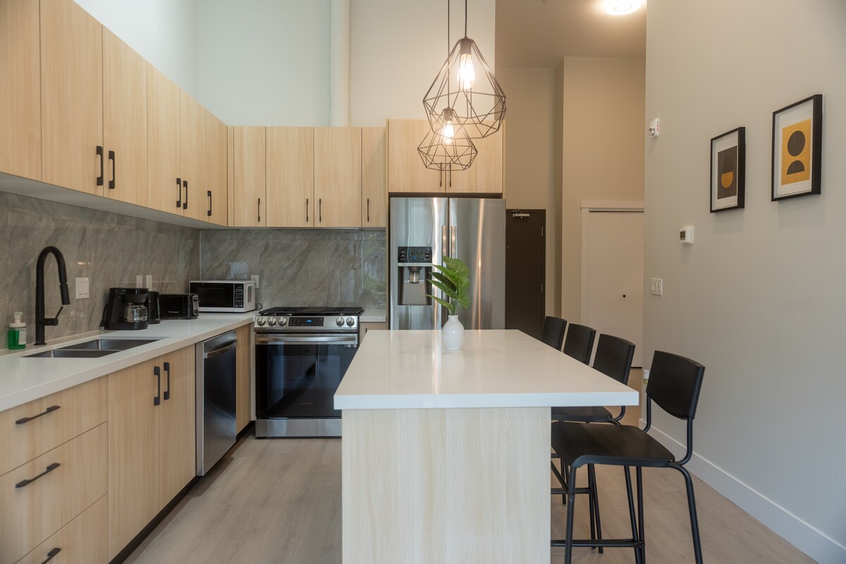 The living area is tastefully decorated and features comfortable seating, making it the perfect place to relax after a day exploring the city. The kitchen is fully equipped with modern appliances and all the necessary utensils to cook delicious meals. The dining area has a beautiful kitchen island with 4 bar stools and 2 chairs.